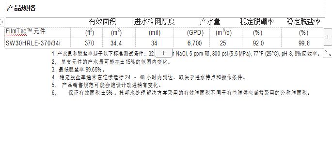 FilmTec™ SW30HRLE-370/34i 元件是一款高耐久性、高脫除率、高產水量海水膜元 件,用于高污染或挑戰性水源的情況,有助于系統的穩定運行和產水成本的降低。