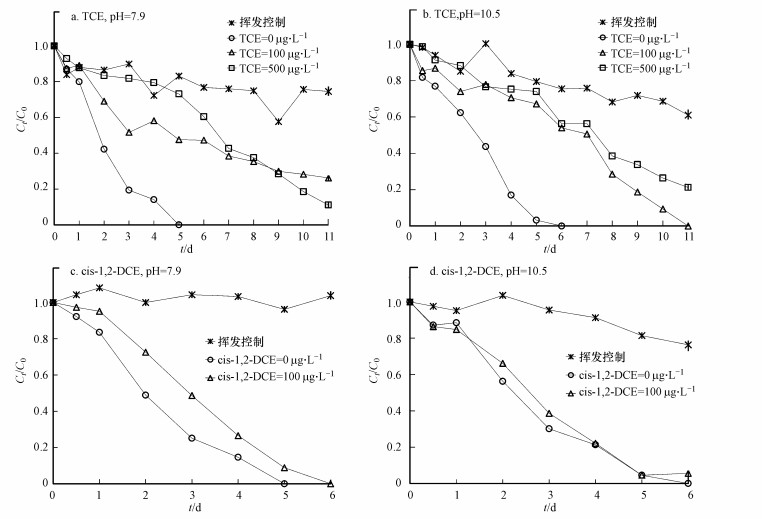 表 1 pH 7.9或10.5時TCE和cis-1, 2-DCE對苯厭氧生物降解的影響