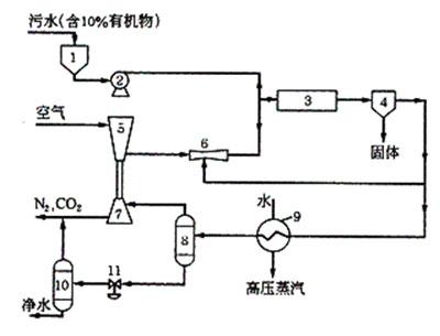 1-污水槽;2-污水泵;3-氧化反應器;4-固體分離器;5-空氣壓縮機;6-循環(huán)用噴射泵;7-膨脹機透平;8-高壓氣液分離器;9-蒸汽發(fā)生器;10-低壓氣液分離器; 減壓器