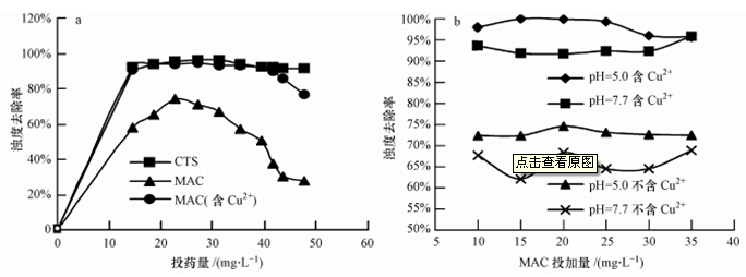 從圖 7a可以看出,殼聚糖和MAC都具有除濁的能力.在水樣不含有重金屬離子的情況下,MAC的除濁能力低于殼聚糖,當水樣含有重金屬離子時,二者的除濁能力相當.圖 7b說明pH值對MAC的除濁能力有一定影響,pH值較低時除濁效果較好,pH值較高時除濁效果較差.殼聚糖本身雖然有一定的除濁效能,但它只能溶于酸性介質,因而限制了其作為絮凝劑的使用操作.殼聚糖經巰基乙酸改性成為MAC后,除濁能力相當,但可以在較高的pH值條件下溶解,水溶性得到了改善,使其作為絮凝劑應用變得簡單易行.