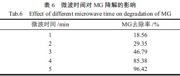微波輻射時(shí)間對MG 降解率的影響如表6 所示。由表6 可知,隨著微波輻射時(shí)間的延長,孔雀石綠的降解率逐漸增加,足夠的微波輻射時(shí)間,對孔雀石綠在微波誘導(dǎo)下發(fā)生催化降解反應(yīng)特別重要,較長的微波輻射時(shí)間與較高的孔雀石綠對應(yīng)。當(dāng)微波輻射時(shí)間為5 min 時(shí),孔雀石綠降解率達(dá)到96.42%。