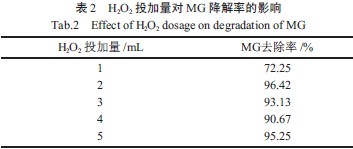 H2O2投加量對MG 降解率的影響如表2 所示。由表2 可知,當(dāng)H2O2投加量從1 mL 增加至2 mL時(shí),孔雀石綠的降解率從72.25%提高到96.42%,而當(dāng)H2O2投加量增加至3 mL 和4 mL 時(shí),降解率出現(xiàn)了降低情況,繼續(xù)增加H2O2投加量,降解率又出現(xiàn)上升趨勢。微波輻射環(huán)境下,通過催化劑的協(xié)同作用,H2O2分解產(chǎn)生·OH,促使了孔雀石綠降解。所以在反應(yīng)之初孔雀石綠的降解率隨H2O2投加量的增加而上升,但同時(shí)H2O2本身又是·OH 的猝滅劑,當(dāng)投加量過多也會(huì)促使·OH 猝滅;生成的·OH 發(fā)生自聚合反應(yīng)重新生成H2O2,導(dǎo)致孔雀石綠染料的降解率出現(xiàn)下降趨勢。當(dāng)繼續(xù)增加H2O2投加量,微波作用使孔雀石綠分子中各原子間鍵能受到削弱,非·OH氧化機(jī)制將在孔雀石綠降解過程中發(fā)揮重要作用,所以微波作用下較大H2O2投加量也可獲得較高的降解率。由于H2O2有一定的使用成本,因此H2O2用量越少就越節(jié)約成本;但是,若H2O2用量過低,微波作用時(shí)間過長,會(huì)增加能量消耗。故H2O2投加量為2 mL。