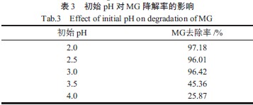 初始pH 對MG 降解效果的影響如表3 所示。由表3 可知,pH 在2.0~3.0 時(shí)脫色效果較好。當(dāng)pH較高時(shí),羥基自由基的產(chǎn)生受到了抑制,同時(shí)Fe3+ 還會(huì)以氫氧化物的形式沉淀,使催化活性降低。另外,H2O2在堿性條件下會(huì)發(fā)生無效分解,導(dǎo)致H2O2的利用率降低,使得反應(yīng)不能順利進(jìn)行,從而脫色率降低。故孔雀石綠初始pH 定為3.0。