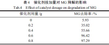 催化劑Fe2O3/γ-Al2O3投加量對MG 降解率的影響如表4 所示。由表4 可知,沒有催化劑存在時(shí)孔雀石綠降解率很低,僅為5.93%,盡管H2O2在微波輻射下會(huì)產(chǎn)生·OH,但該途徑發(fā)揮的作用十分有限,隨著催化劑的加入,孔雀石綠的降解率迅速增加,說明催化劑的作用在孔雀石綠降解中作用顯著;隨著催化劑的繼續(xù)增加,孔雀石綠的降解率變化趨于平緩。當(dāng)催化劑投加量為0.6 g時(shí)孔雀石綠降解率達(dá)到96.42%。