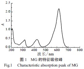 配置質(zhì)量濃度30.00 mg/L 的孔雀石綠溶液,吸光度用NE-300 紫外- 可見分光光度儀對其在200~800 nm 掃描,測出其比較大吸收波長為616 nm(見圖1),本文中所有吸光度數(shù)據(jù)均用去離子水為參比;孔雀石綠染料pH 采用pHs-3c 型精密酸度計(jì)測定。
