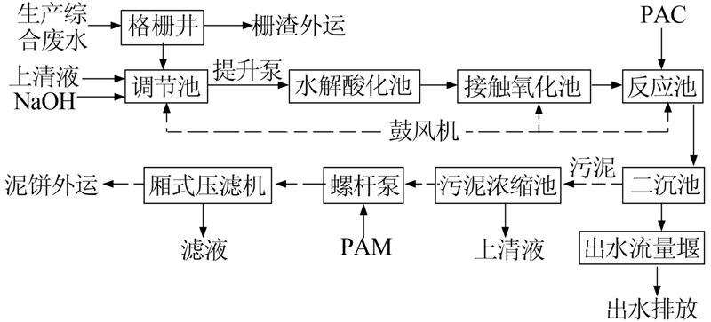生產(chǎn)廢水中含有的較大藥渣、漂浮物顆粒經(jīng)過前置的格柵攔截后得到有效去除,廢水經(jīng)格柵井后自流入調(diào)節(jié)池進(jìn)行初步的勻質(zhì)、勻量,同時(shí)在調(diào)節(jié)池內(nèi)由計(jì)量泵添加一定濃度的堿液,將廢水的pH由初始的4.0~6.0調(diào)整為7.0~9.0;在調(diào)節(jié)pH的同時(shí)需利用羅茨鼓風(fēng)機(jī)往池內(nèi)曝氣,主要是因?yàn)樵谡{(diào)節(jié)池內(nèi)對廢水進(jìn)行預(yù)曝氣及攪拌可以盡可能地避免大量SS在調(diào)節(jié)池內(nèi)堆積和發(fā)酵,同時(shí)還能夠?qū)U水中的低分子有機(jī)污染物吹脫氧化。隨后由潛污泵提升至水解酸化池。在水解酸化池中得到馴化、培養(yǎng)的大量厭氧微生物,則直接將廢水中所含的大部分高分子有機(jī)污染物破碎降解為小分子有機(jī)污染物,進(jìn)而提高廢水的可生化性,有效地緩解后續(xù)好氧生化處理工序的處理壓力。廢水經(jīng)水解酸化處理后自流進(jìn)入接觸氧化池,接觸氧化池中的好氧微生物種群及硝化菌菌群在池內(nèi)羅茨鼓風(fēng)機(jī)曝氣充氧的情況下,大量的有機(jī)污染物被好氧微生物種群氧化降解為CO2和H2O,廢水中的氨氮?jiǎng)t被氧化為硝酸鹽和亞硝酸鹽得以去除。經(jīng)接觸氧化池處理后的出水還需通過外加聚合氯化鋁(PAC)進(jìn)行比較終的混凝沉淀反應(yīng),作用是使廢水中不易沉淀的細(xì)小顆粒絮體凝聚形成大顆粒絮體,混合液隨后進(jìn)入二沉池內(nèi)進(jìn)行固液分離,保證比較終出水水質(zhì)穩(wěn)定達(dá)到排放標(biāo)準(zhǔn)要求。固液分離后的上清液溢流進(jìn)入出水流量堰可達(dá)標(biāo)排放,剩余污泥則排入污泥濃縮池進(jìn)行污泥濃縮處理。