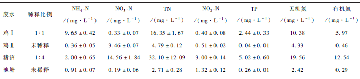 養雞場廢水和養豬場沼液均取自合肥溫氏畜牧有限公司下屬養殖場。其中雞Ⅰ廢水(以下簡稱“雞Ⅰ”)為雞舍污水厭氧發酵處理后,進入植物凈化池的廢水;雞Ⅱ廢水(以下簡稱“雞Ⅱ”)為經植物池凈化后進入第二植物凈化池的廢水;豬沼廢水(以下簡稱“豬沼”)為豬場通過清糞-沉淀池-酸化池等處理工藝流程排出的沼液經沉淀后的上清液;池塘廢水(以下簡稱“池塘”)為本單位觀賞魚養殖池塘水。