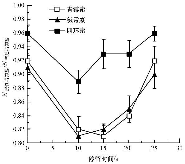 為了表征四環素抗性菌的抗性變化,用含一定濃度抗生素(青霉素、氯霉素和四環素的濃度分別為16、32、16 mg · L-1)的營養瓊脂培養基測定四環素抗性菌濃度,用所得結果與普通培養基測定結果之比(N抗性培養基/N普通培養基)表示四環素抗性菌抗性.該比值越高,表示抗性越強.