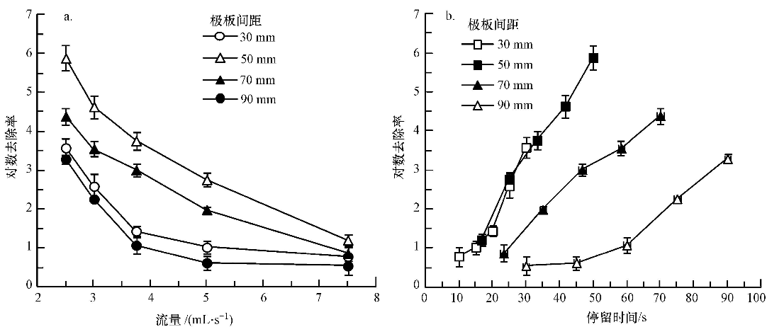 圖3 電極板間距對普通大腸桿菌對數去除率的影響(a.不同流量下的電化學滅活效果;b.不同停留時間下的電化學滅活效果)