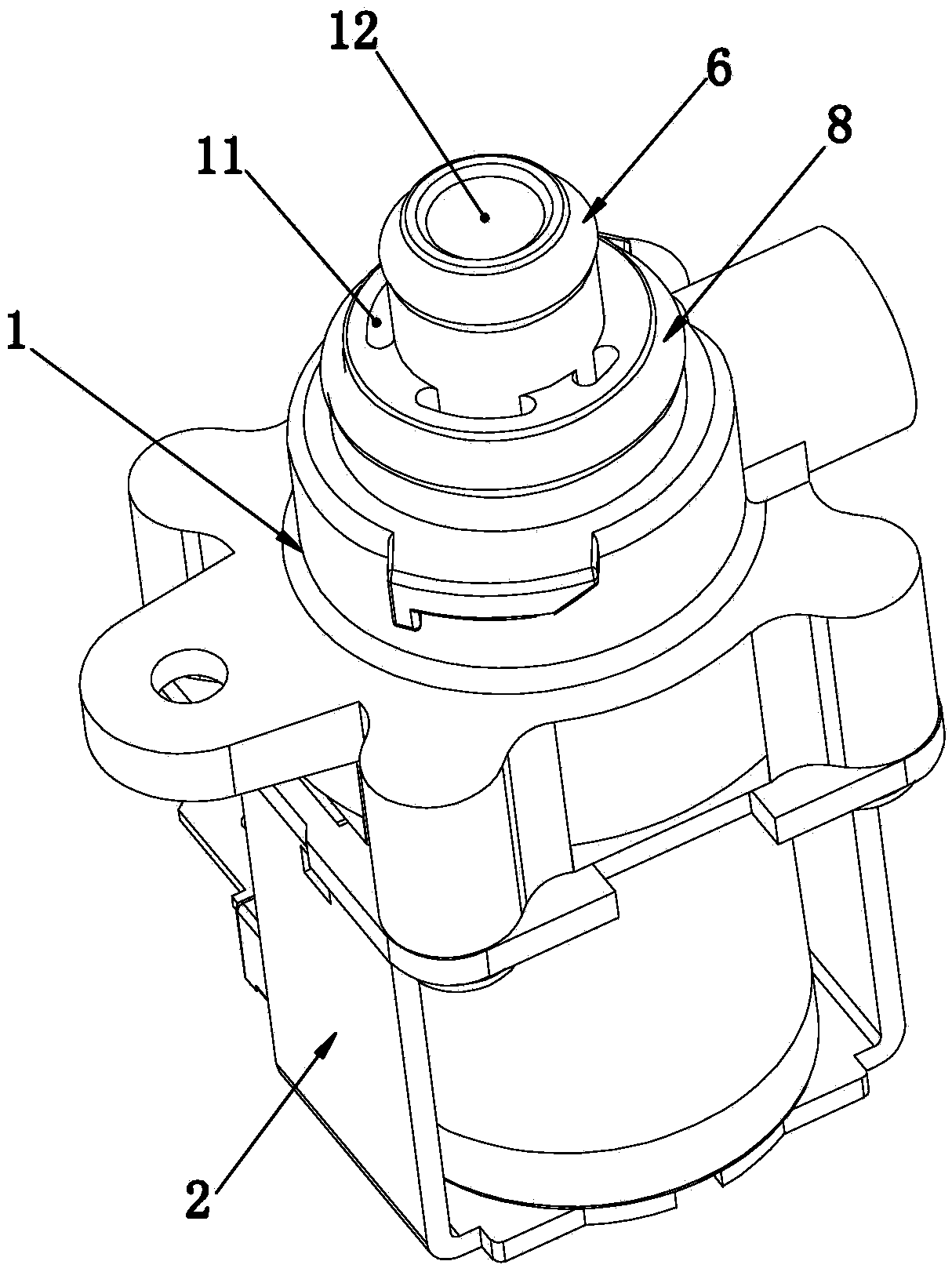本實用新型進一步設置為:介質流出通道設于閥體上對于設置電磁機構一端的另一端,介質流出通道為延伸至閥體連接腔內的管體,該管體的周邊設置若干個與連接腔導通的孔,該孔為介質進入通道。