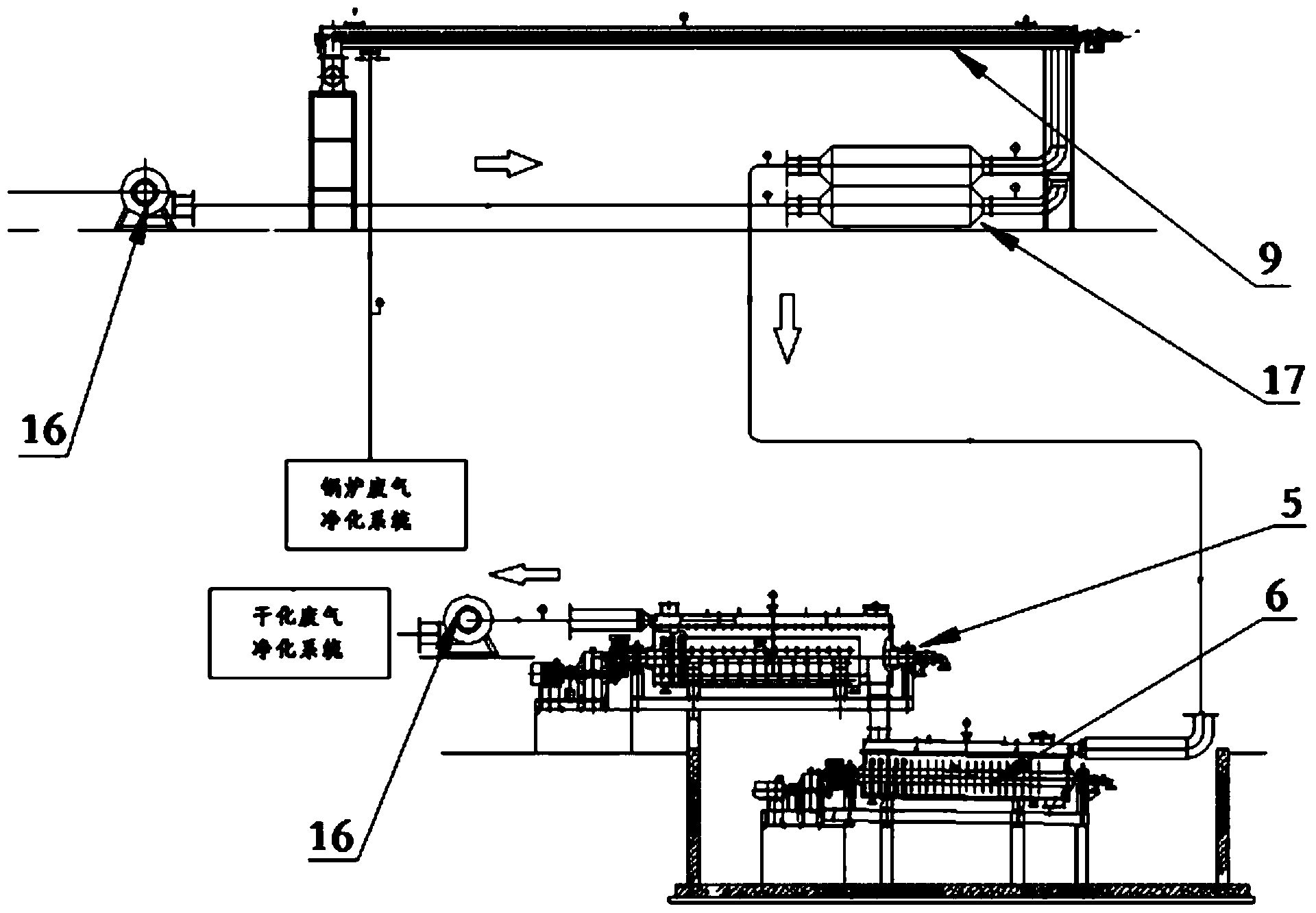 6.根據(jù)權(quán)利要求1所述的污泥處置系統(tǒng),其特征在于,所述尾氣處理裝置包括熱量回收裝置,一尾氣凈化裝置;所述熱量回收裝置包括一氣體換熱裝置,換熱裝置設(shè)有鍋爐廢氣入口、鍋爐廢氣出口,空氣入口,空氣出口;高溫鍋爐廢氣進(jìn)入氣體換熱裝置后將熱量傳遞給進(jìn)入氣體換熱裝置的常溫空氣,降溫后的鍋爐廢氣繼續(xù)進(jìn)入炭化污泥的烘干裝置,然后進(jìn)入鍋爐廢氣凈化系統(tǒng);升溫后的空氣先后進(jìn)入污泥炭化裝置、污泥干燥裝置然后成為干化廢氣,比較后進(jìn)入干化廢氣凈化系統(tǒng)。