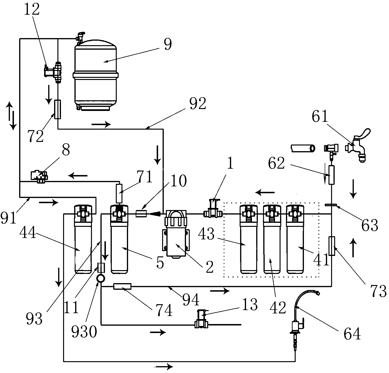 進一步地,所述水路板內置的濃水通路上安裝有磁化器,磁化器位于濃水電磁閥之前,濃水經磁化后流入濃水電磁閥。