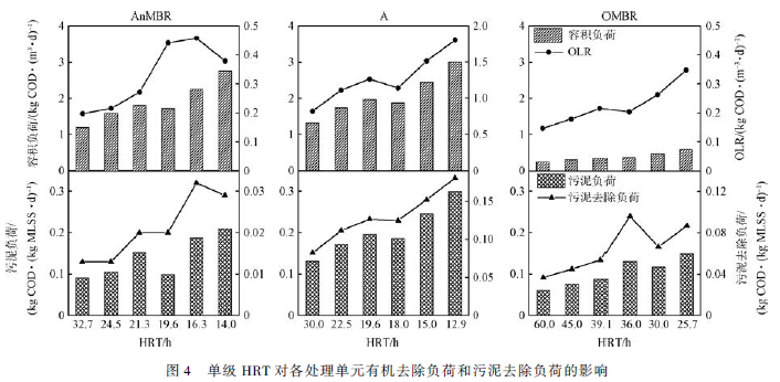 HRT 是廢水處理系統比較重要的設計和運行參數,直接影響污泥微生物降解污染物的效果,一定程度上延長HRT 可以提高污染物的降解率。但適當縮短HRT 能夠充分利用污泥的微生物生物活性,提高其有機負荷和污泥去除負荷。在保證系統處理效率的前提下,綜合考慮有機污染物的去除效果,同時使An-MBR 單級去除負荷達到比較大,確定處理系統總HRT 為61. 3 h,AnMBR、A、OMBR 各處理單元的單級HRT分別為16. 3、15 和30 h。