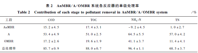 AnMBR/ A/ OMBR 系統各反應器的單級處理率如表2 所示。由于膜對微生物的截留作用,穩定運行期間AnMBR 中活性污泥濃度較高(約為(15. 3 ± 1. 7)g·L - 1 ),對COD 和TOC 的去除率分別達到15% 和17% 。AnMBR 出水NH3 -N 濃度高于進水,說明含氮有機物在AnMBR 中釋放NH3 -N。缺氧反應器對各污染物降解的貢獻比較大,去除率均大于50% 。OMBR 對NH3 -N 的去除率比較大,達到40% 以上。