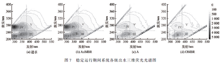 3)進水中Ⅰ、Ⅱ區芳香族蛋白質類似物和Ⅳ區溶解性微生物副產物的總和所占比例達88. 5% ,An-MBR/ A/ OMBR 系統出水中Ⅱ區芳香族蛋白質類似物含量比較高,相對較難降解。