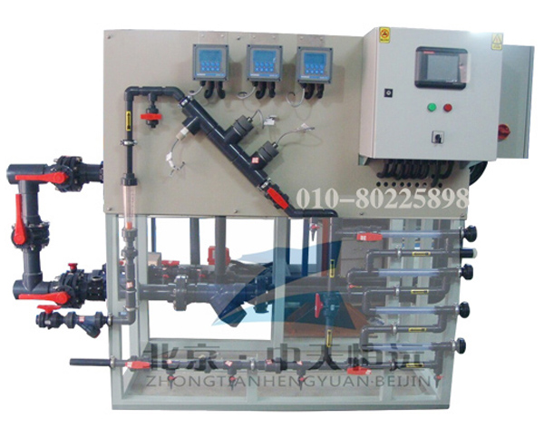 示蹤劑加藥裝置由示蹤劑儀表、PH儀表、0RP儀表、電導率儀表、控制系統、無線遠傳系統等部分組成。其工作原理是由示蹤劑儀表檢測循環水系統中藥劑的濃度,進行PID運算,然后自控制系統啟動或關閉加藥泵往循環水系統添加藥劑。其功能是使藥劑穩定在一定的濃度范圍,達到保護管道不會結垢或腐蝕的趨勢。循環水系統進行排污或補水時,只要藥劑濃度滿足設定值,加藥泵依然不向系統中投加藥劑。從而節約客戶使用藥劑的成本。
