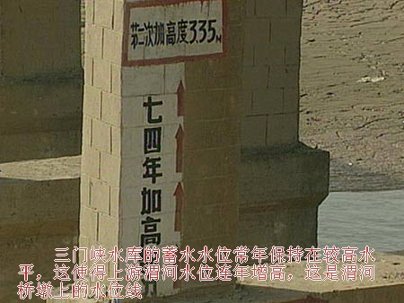 在渭河上的這個橋墩,記者看到,在1969年,該橋加高了3.05米,1974年,該橋又加高了3.35米。而對于生活在渭河附近的居民來說,渭河的升高,他們體會的更深。陜西省華縣下廟鎮農民徒拴牢說:“那時(過去)河就是,我跟你說,河淺淺的。河梁(河岸)就是這么高一點,看看有兩、三尺高。現在河底子都比那高,比河梁(河岸)都高。”
