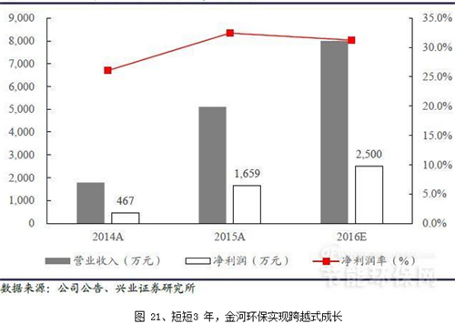金河環(huán)保成為工業(yè)廢水第三方治理先驅(qū)。內(nèi)蒙古金河環(huán)保是國(guó)內(nèi)領(lǐng)先的致力于工業(yè)廢水、城市污水、氣味治理及固廢棄物無(wú)害化、資源化利用的專業(yè)環(huán)保公司。1)技術(shù):污水處理采用擁有自主知識(shí)產(chǎn)權(quán)的.JAOO.工藝+.耦合沉淀.工藝,其中JAOO.工藝已成功用于煤化行業(yè)、制藥行業(yè)、氨基酸行業(yè)、石化等行業(yè)。工藝上具有高效脫碳、脫氮、節(jié)堿等顯著特點(diǎn);運(yùn)行上具有出水氨氮低,總氮去除率高、系統(tǒng)耐沖擊,穩(wěn)定性強(qiáng),可操作性好的特點(diǎn)。.耦合沉淀.工藝,屬于國(guó)內(nèi)獨(dú)家首創(chuàng),具有COD 去除率高、脫色效果好、藥劑費(fèi)用低等特點(diǎn)。未來(lái)環(huán)保公司業(yè)務(wù)發(fā)展空間巨大。2)處理能力:公司已建成日處理水量8,000-10,000 噸,日處理COD70-80 噸的工業(yè)一級(jí)污水處理系統(tǒng)3)商業(yè)模式:給園區(qū)醫(yī)藥企業(yè)提供