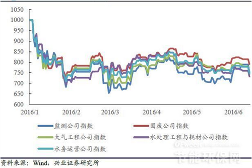 經(jīng)歷2015年股市亢奮行情后,2016年上半年出現(xiàn)較大幅度向下調(diào)整。年初至今,A股環(huán)保指數(shù)、上證綜指、創(chuàng)業(yè)板指分別下跌25.3%、20.0%、24.3%。年初至今,監(jiān)測(cè)版塊、固廢版塊、大氣工程版塊、水處理工程版塊、水務(wù)運(yùn)營(yíng)版塊分別下跌24.7%、20.9%、25.8%、26.7%、25.3%。