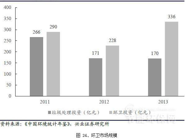 2013 年,環(huán)衛(wèi)市場(chǎng)規(guī)模達(dá)到336 億元,明顯大于垃圾處理行業(yè)。2011、2012 年,環(huán)衛(wèi)市場(chǎng)規(guī)模分別為290、228 億元,市場(chǎng)規(guī)模明顯大于垃圾處理行業(yè)。
