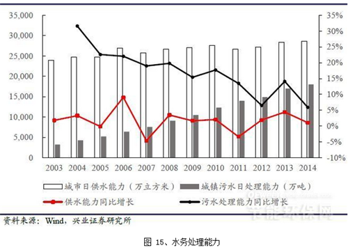 水處理工程、水務(wù)運(yùn)營(yíng):1)水務(wù)行業(yè)整體保持較快增長(zhǎng):城市供水能力保持了穩(wěn)定的增長(zhǎng),五年復(fù)合增長(zhǎng)率達(dá)到1.2%,2013 年增長(zhǎng)率為1.1%。城鎮(zhèn)污水處理能力達(dá)到較快增長(zhǎng),五年符合增長(zhǎng)率達(dá)到11%,2013 年增長(zhǎng)率為5.9%。水十條預(yù)計(jì)投資總額將達(dá)到2 萬(wàn)億元,將從量變——側(cè)重大規(guī)模水務(wù)投資逐漸轉(zhuǎn)向質(zhì)變——提高排放水質(zhì)和加強(qiáng)水質(zhì)監(jiān)測(cè)等。我們強(qiáng)調(diào)水十條或是水處理提標(biāo)化的重要轉(zhuǎn)折點(diǎn);另外我們強(qiáng)調(diào)PPP 模式將是水處理工程行業(yè)的另一個(gè)變量,地方政府和水處理公司的結(jié)合將帶來(lái)地方水處理需求的集中釋放,這也是我們推薦水處理工程行業(yè)的一個(gè)重要的邏輯支點(diǎn)。2)水處理板塊增速:水處理工程板塊13、14、15 年扣非業(yè)績(jī)同比增長(zhǎng)45%、18%、20%。