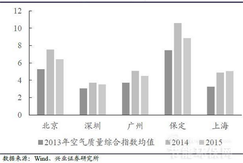 但是無(wú)論從直觀還是數(shù)據(jù)上,空氣質(zhì)量并無(wú)明顯改善。從直觀感受來(lái)看,今年冬季霧霾非常嚴(yán)重,以華北地區(qū)尤甚。從數(shù)據(jù)來(lái)看,重點(diǎn)城市2014 年、2015 年空氣質(zhì)量綜合指數(shù)相對(duì)2013 年有所惡化;中國(guó)的空氣質(zhì)量指數(shù)明顯比國(guó)外惡劣。