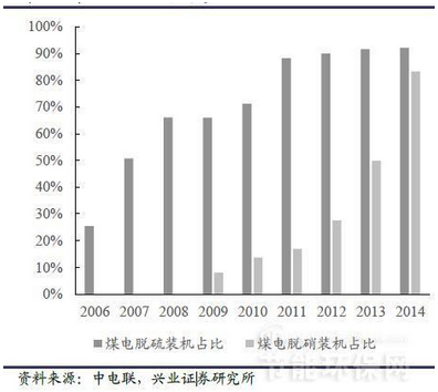 .補(bǔ)貼電價(jià)+排污費(fèi)+排放標(biāo)準(zhǔn).三重政策驅(qū)動(dòng)下,火電脫硫脫硝接近完成。1)政策驅(qū)動(dòng):2004年脫硫補(bǔ)貼電價(jià)1.5分/度出臺(tái)。2011年脫硝電價(jià)試點(diǎn)0.8分/度出臺(tái)。2013年脫硝電價(jià)1.0分/度出臺(tái)。2014年7月前,排放標(biāo)準(zhǔn)要求現(xiàn)有火電機(jī)組要求完成脫硫脫硝改造。2015年6月前,二氧化硫和氮氧化物排污費(fèi)征收標(biāo)準(zhǔn)調(diào)整至不低于每污染當(dāng)量1.2元;此次調(diào)整后,這兩項(xiàng)標(biāo)準(zhǔn)均翻了一倍。2)脫硫脫硝接近完成:截至2015年底,全國(guó)已投運(yùn)火電廠煙氣脫硫機(jī)組容量約8.2億千瓦,占全國(guó)煤電機(jī)組容量92.8%;已投運(yùn)火電廠煙氣脫硝機(jī)組容量約8.5億千瓦,占全國(guó)煤電機(jī)組容量的95.0%。