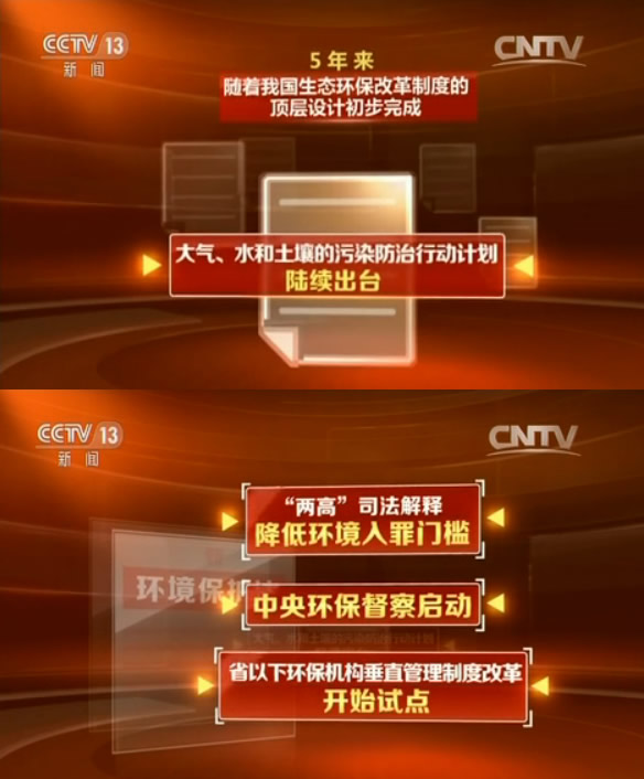 五年來,隨著我國生態環保改革制度的頂層設計初步完成,大氣、水和土壤的污染防治行動計劃陸續出臺,新《環境保護法》頒布施行,“兩高”司法解釋降低環境入罪門檻、中央環保督察啟動、省以下環保機構垂直管理制度改革開始試點,各項關切民生的生態制度出臺的密集程度前所未有。
