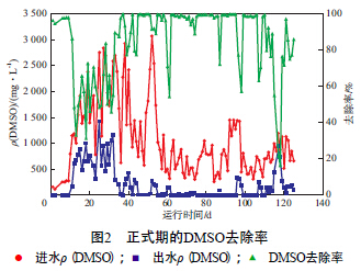 在正式期的第11天~第54天,持續的進水DMSO高負荷對模試裝置的運行形成沖擊,當DMSO處于高負荷狀態時DMSO的去除效果見表3。