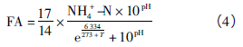 pH 會影響微生物的生存條件,同時也會影響氨在廢水中的存在形態,AOB 適宜pH 值在7.0~8.5。Anthonisen 等研究表明,FA 對AOB 和NOB 都有抑制作用,對AOB 的抑制濃度為10~150 mg /L,對NOB 的抑制濃度為0.1~1.0 mg /L。本實驗控制溫度為(30 ± 1) ℃,進水氨氮濃度為10.69~320.79mg /L,調節進水pH 值為8.0 左右,DO 為4.0~5.5mg /L,按照溶液中FA 的濃度計算公式(4) 計算,進水初始FA 濃度為1~30 mg /L。