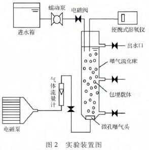 本實驗所用的曝氣流化床反應器如圖2 所示。玻璃柱體有效容積約為1.5 L,內徑8 cm,高40cm。反應器內包埋載體填充率為15%,采用間歇式進水,實驗模擬廢水根據現場合成氨工業廢水濃度進行配置,以氯化銨為氨源,投加NaHCO3維持堿度,pH 維持在8.0 左右,不同初始游離氨、有機物濃度廢水根據實驗所需另行配置。溫度通過加熱棒進行調節,利用電磁式空氣泵進行微孔曝氣,用氣體流量計來控制曝氣量,反應器每隔12 h 進出水,出水檢測NH4+-N、NO2--N、NO3--N 濃度。