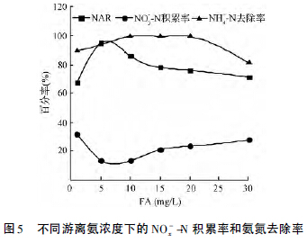 實驗結果如圖5 所示,NAR隨著FA 的濃度增加先升高,在FA = 6.5 mg /L,NAR為97%,達到比較大值后又開始下降,但硝酸鹽積累率隨著FA 濃度的增加先減低后升高,說明高濃度FA 條件下,會抑制AOB 的活性,對NOB 的抑制效果不明顯,同時,NOB 會逐漸適應高濃度的FA。在FA = 10~20 mg /L 之間,氨氮去除率高達99%,NAR在此FA 濃度范圍內是下降的,而NO3--N 積累率卻是上升的過程,由此可見,NOB 氧化了短程硝化產生的NO2-。因此高濃度FA 條件下造成NAR降低的原因有2 個: 一是高濃度FA 會抑制AOB 的活性,減少NO2-的生成量; 一是NOB 活性未受抑制,利用NO2-為底物,將其氧化成NO3-。綜上所述,高濃度FA 會阻礙短程硝化的進程,但是由于NOB 的活性未受抑制,仍然可以取得穩定的NAR和較高的氨氮去除率。