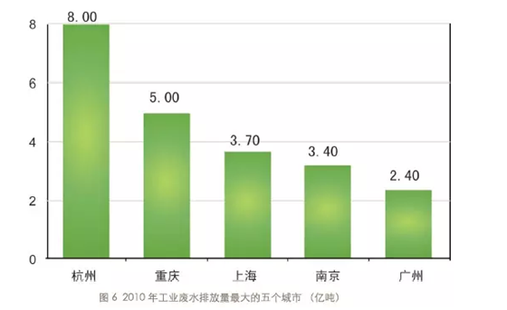 作為中國制造業(yè)聚集地,長三角和珠三角的三個省份必定入榜,如圖5所示,五大省份的工業(yè)廢水排放量占了全國總量的44%。若以城市排放量為依據(jù),則如圖6所示,這五大城市的排放量占全國工業(yè)廢水排放總量的9%強。可以看出,這些工業(yè)廢水的主要來源地全都分布在重要水域,印證了重污染企業(yè)臨水而建的說法。這種布局在給企業(yè)造成生產(chǎn)便利的同時,也給了私自取水和非法排水等行為以可乘之機,給監(jiān)管實施帶來巨大挑戰(zhàn)。