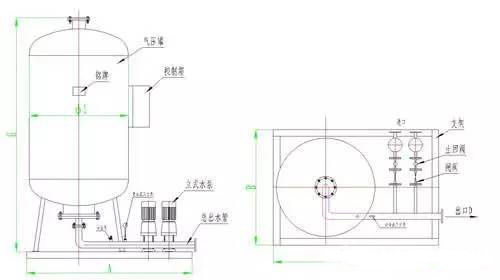 P2=(P1+0.1)/β-0.1β:工作壓力比,一般取0.65~0.85 (3)安全閥開(kāi)啟壓力P3: P3=P2+0.03式中壓力(壓強(qiáng))計(jì)算單位均為“MPa” 氣壓罐總?cè)莘e: V=Vt/(1-β) Vt-調(diào)節(jié)水量(m3),為補(bǔ)水泵3min的流量,且保持水箱調(diào)節(jié)水位不小于200mm。估算時(shí)取膨脹水量的一半。