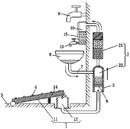 二,根據權利要求1所述的一種生活污水循環利用節水系統,其特征在于:所述踏板(11)的下表面中部還裝置有彈性復位裝置(14),所述彈性復位裝置(14)的兩端分別固定于踏板(11)的下部和地板(3)的表面。