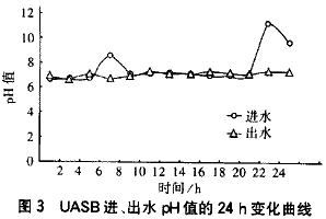 由于廠區占地有限,UASB之前未設調節池,進水COD濃度、pH值一天之內波動很大。在較強的沖擊負荷下,UASB出水有時帶出一些絮狀污泥,使其COD增高,在一定程度上影響了出水水質,但從總的運行來看,UASB具有較強的抗廢水沖擊能力,處理效果穩定,出水COD(混合液)一般在500 mg/L左右,pH在7左右。2001年6月6日對UASB進行了24 h連續監測,所測數據包括進、出水COD濃度、pH值,其中出水COD分別測混合液和上清液兩種水樣。圖2、3分別為UASB進、出水COD和pH值的24 h變化曲線。