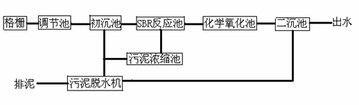 (1) PH=6~9 工藝優(yōu)點(diǎn): SBR相對于連續(xù)流系統(tǒng)有許多其它方面的優(yōu)點(diǎn)。首先,這種反應(yīng)器運(yùn)行靈活簡潔。它可以配合不同的進(jìn)水水質(zhì)調(diào)整運(yùn)行模式。第二,SBR流態(tài)上屬于完全混合,而在有機(jī)物降解方面卻是時(shí)間上推流。因此為了達(dá)到較高去除率而只需調(diào)整反應(yīng)時(shí)間。這樣大大減少了占地,特別適合中小型水廠。第三,SBR的沉淀階段使泥水有效分離,出水懸浮物濃度低,無需另設(shè)澄清池。第四,SBR工藝很多情況還可不設(shè)初沉池,因而基建費(fèi)用低,占地少。 化學(xué)氧化法是利用化學(xué)氧化劑的氧化作用將水中的污染物轉(zhuǎn)化為微毒或無毒的物質(zhì),或?qū)⑵滢D(zhuǎn)化易于分離的形態(tài)的處理方法。他比較終能實(shí)現(xiàn)污染物的無害化處理。其特點(diǎn)為反應(yīng)速度快,適用范圍廣,可使部分有機(jī)物礦化。反應(yīng)條件溫和,通常對溫度和壓力沒有要求,不需要在強(qiáng)酸強(qiáng)堿介質(zhì)中進(jìn)行。由于是一種物理化學(xué)處理過程,易于控制,化學(xué)氧化法操作簡單,易于設(shè)備化。 1.5 流程簡圖