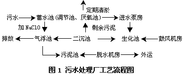 印染工業在我國比較發達,廢水的主要特點是廢水色度、COD濃度較高,廢水中含有染料、漿料、助劑、油劑、酸堿,纖維雜質及無機鹽等,其處理工藝也相對成熟,國內多數印染廢水均采用厭氧——好氧生物處理工藝,厭氧水解的主要作用是使印染廢水中的難降解有機物及其發色基團解體、被取代或裂解,從而降低廢水的色度,改善其可生化性,提高其BOD5/CODcr比值;好氧段的主要作用是氧化分解厭氧反應后的產物,包括一些易降解小分子有機物及染料中的某些發色基團等在好氧段中進一步去除。在一定停留時間內(厭氧10h,好氧10h),處理出水能達到《紡織染整工業水污染物排放標準GB4287-92》的二級排放標準。但由于國家新的排放標準(GB8978-96)的執行,印染工業廢水經厭氧—好氧工藝處理不能保證新的排放要求(CODcr<100 mg/l,色度<50倍),必須增加三級處理措施。原有污水廠有一套小型氣浮設施,經設備調試運轉后效果良好,因此,本工程設計中不再對三級處理設施進行小試,直接選用氣浮和次氯酸鈉脫色作為污水廠處理水達標排放的把關措施。