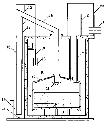1 進水總管 2 進水分配堰 3 豎井進水渠 4 消能板 5 濾料層 6 承托層 7 小阻力配水系統 8 配水空間 9 連通區 10 沖洗水箱 11 出水渠 12 虹吸輔助管 13 抽氣管 14 虹吸上升管 15 虹吸下降管 16 排水渠 17 反沖洗調節器 18 虹吸破壞斗 19 虹吸破壞?管 20 傘形頂蓋 21 水封斗 22 進水分配箱