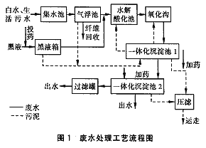 廣西某公司是一采用毛竹為原料的造紙廠,其廢水主要來源于堿液浸泡(40%燒堿)后水洗產生的黑液和抄紙機廢水——白水。其中,白水連續排放(1 200t/d),COD為700~1 200mg/L,pH值為7.2~9.5;黑液間歇排放(100t/d),COD為12 000~24 000 mg/L,pH值為9.2~11.5。此外,還有部分生活污水(約100t/d),COD為200mg/L。廢水主要成分有:纖維、纖維素分解生成的糖類、醇類、有機酸、木質素及其衍生物,少量的樹脂酸、脂肪酸等。