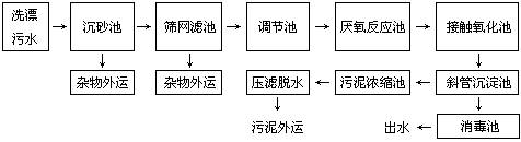 洗漂廢水由于其成分復雜、可生化性較差,是較難處理的工業污水種類之一。早期大多采用簡單物化沉淀或氣浮,然后用活性污泥法來處理。隨著人們對周圍水體的環境質量要求越來越高,排放污染物的控制指標(如BOD、COD)越來越嚴,我公司采用成熟的“預處理-厭氧(酸化水解)-接觸氧化-沉淀-消毒”綜合處理的工藝。廢水通過沉砂、篩網過濾預處理后進入調節池,生化處理采用“厭氧(酸化水解)—接觸氧化”,利用微生物多級新陳代謝來降解和去除廢水中的污染物。生化后的污水采用沉淀池進行泥水分離,上清液在消毒池中經強氧化劑消毒,達到殺菌的目的,使之達到排放標準。
