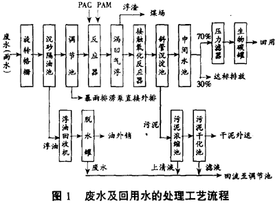 機械工廠廢水中主要污染物是油,根據(jù)油在廢水中存在形態(tài)的不同,分別采用不同的工序予以去除。廢水及回用水的處理工藝流程見圖1。