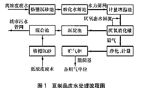 高濃度廢水經(jīng)酸化水解—厭氧消化后,出水與低濃度廢水混合,泵入城市排污管網(wǎng)。具體工藝流程見(jiàn)圖1。