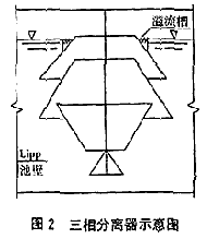 、儆捎趶U水處理設(shè)施正好位于原有的池塘上,其地基承載力和土質(zhì)均勻度都很差,如采用鋼筋混凝土結(jié)構(gòu),由于其自重大,地基處理費(fèi)用就相當(dāng)高。厭氧罐和貯氣柜設(shè)計(jì)采用德國(guó)引進(jìn)的Lipp罐體,由于罐體自重輕,基礎(chǔ)比較容易處理,費(fèi)用隨之降低。厭氧消化罐高為9 m,直徑為7 m,是地上式圓形Lipp罐。由于對(duì)厭氧消化罐的徑、高比進(jìn)行了調(diào)整,原有的三相分離器就不是很適合。因此,對(duì)三相分離器進(jìn)行了重新設(shè)計(jì),采用三層鋼結(jié)構(gòu)漏斗式導(dǎo)流板做三相分離器(見(jiàn)圖2)。從使用結(jié)果看,三相分離效果相當(dāng)好,厭氧污泥流失量很小,污泥截留效果明顯。