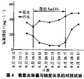 按照生活污水中有40mg/L氨氮被氧化成NO3-(堿度/氨氮=8.85)來計算,好氧反應區內硝化反應正常進行需要堿度為354 mg/L(以CaCO3計),而進入好氧段的污水中堿度平均為210mg/L,可見原水經過缺氧段處理后堿度不能滿足硝化反應的需要,理論上生活污水中需要投加144mg/L的CaCO3(相當于153mg/L的Na2CO3)。當回流比為200%時投加Na2CO3以滿足堿度需求的前后對照試驗見圖4。?