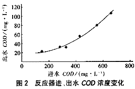 為考察不同進水COD濃度下的處理效果,試驗按低濃度(COD為190~380mg/L、SCOD為98~133mg/L)、中等濃度(COD為428~525mg/L、SCOD為288~440mg/L)、高濃度(COD為553~659mg/L、SCOD為423~518mg/L)3個階段進行,其中低濃度時直接采用生活污水,中、高濃度時則在原水中加入工業葡萄糖。試驗結果見表2和圖2。