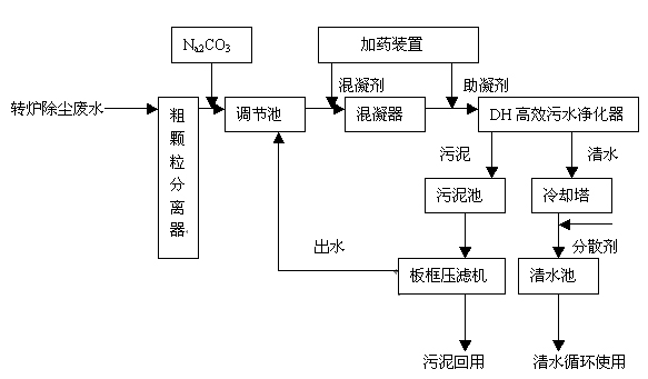 對轉爐除塵廢水處理的沉淀效率、水質穩定、污泥回收等幾個方面的考慮,以實現穩定的水閉路循環為目的,典型工藝流程如下: