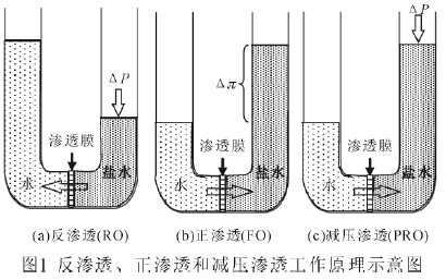 Lee 等(1981)[1]較早地概況總結(jié)了反滲透(RO)、正滲透(FO)和減壓滲透((Pressure Retarded Osmosis,PRO)過程的工作原理,如圖1 所示。在RO 過程中,水在外加壓力作用下從低化學(xué)勢側(cè)通過滲透膜擴散至高化學(xué)勢側(cè)溶液中( Δπ<ΔP),達到脫鹽目的。正滲透過程剛好相反,水在滲透壓作用下從化學(xué)勢高的一側(cè)自發(fā)擴散到化學(xué)勢低的一側(cè)溶液。而減壓滲透可認為是反滲透和正滲透的中間過程,水壓作用于滲透壓梯度的反方向,水的凈通量仍然是向濃縮液方向。這三個過程可以用下式來描述:Jw=A(σΔπ-ΔP);式中Jw—水通量;A—膜的水滲透性常數(shù);σ—反擴散系數(shù);Δπ—膜兩側(cè)的滲透壓差;ΔP—膜兩側(cè)的壓力差。