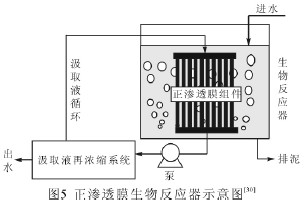正滲透由于過程本身具有低壓、低能耗和低污染的特點,從理論上講適合于作為膜生物反應(yīng)器中的膜過程。這方面的探索目前剛起步,文獻可查的只有2處報道。Achilli 等[30]等發(fā)展了如圖5 所示的一套正滲透膜生物反應(yīng)器系統(tǒng)處理高濃度人工配水,對有機物和氨氮的去除率分別為99%和98%。運行過程中,膜通量較高,膜污染較輕并可通過對膜面反沖洗進行有效控制。Cornelissen 等[31]發(fā)展了類似的系統(tǒng)并著重研究膜污染過程,發(fā)現(xiàn)可逆的和不可逆的膜污染均沒有明顯發(fā)生。這些研究表明,正滲透膜生物反應(yīng)器可作為傳統(tǒng)膜生物反應(yīng)器的替代技術(shù),具有顯著優(yōu)勢和廣泛應(yīng)用前景。