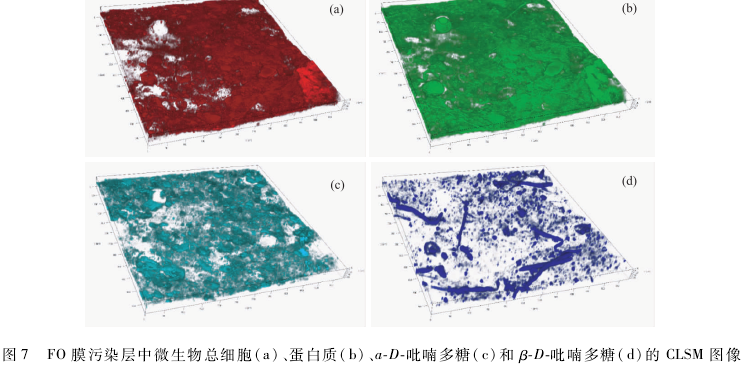 圖7為MFO-MBR連續運行30 d后FO膜表面生物污染層中總細胞、蛋白質、α-D-毗喃多糖及β-D-毗喃多糖4種污染物質的CLSM圖像。從圖7可以看出,FO膜的生物污染層主要由總細胞、蛋白質、α-D-毗喃多糖及β-D-毗喃多糖這4種物質組成,成分與已有研究相似。微生物總細胞在膜面聚集且形成一層致密的污染層。蛋白質與微生物總細胞一樣,大量聚集成塊狀沉積在FO膜表面,形成致密的蛋白質污染層。與總細胞和蛋白質相比,α-D-毗喃多糖的含量較少,且比較松散,孔隙率較大,而β-D-毗喃多糖分布更松散,僅有部分呈條帶狀分布。與已有研究相比,本研究TFC污染膜面的生物總細胞的量明顯增多,這可能是由于鹽度緩解后,微生物的量有所增加。